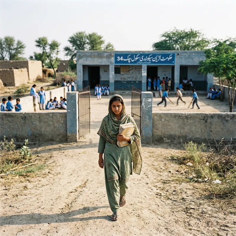 A scene of a Pakistani rural area. In the foreground, an ethnically South Asian girl in traditional Pakistani clothing walks away from a school building that is seen in the background. Her sad expression and the books in her hands suggest she's dropping out of secondary school. In the school courtyard, other Pakistani students of diverse genders and descents are engaging in different activities, suggesting a busy school environment.