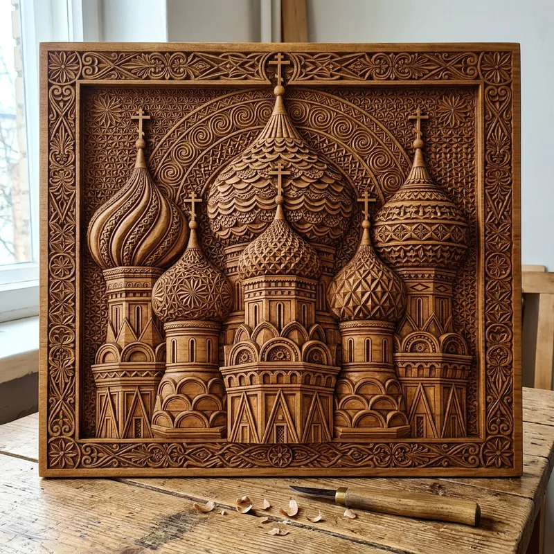 Russian Chip Carving design inspired by elements of traditional Russian architecture. Imagine intricate patterns engraved on wood that reflect the shape and detail of Russian domes like the ones seen on St.Basil's Cathedral. The carving should be both aesthetic and meticulous showing depth through alternation of light and shadows while the domes themselves should be ornately decorated, showcasing a plethora of shapes, lines, and patterns.