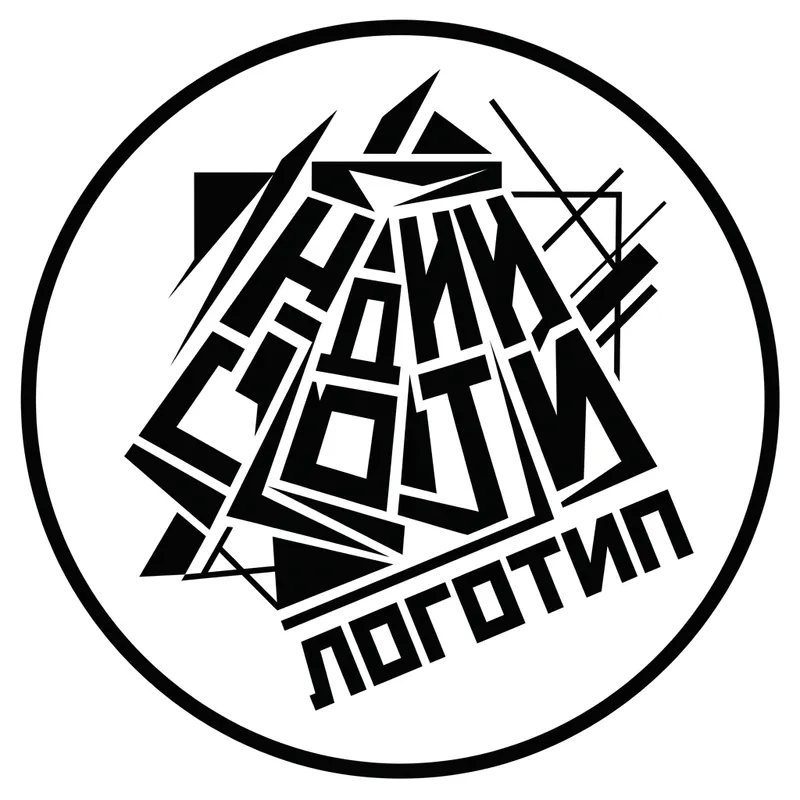 Create a round logo that features the letter outline of a girl's skirt. The design should be reminiscent of Russian Constructivism, characterized by bold lines and geometric shapes. The color composition should be in black and white, inspired by the styles of artists whose work was prominent during the early 20th century in Russia, similar to the abstract and geometric nature of El Lissitzky and Alexander Rodchenko's works. The graphic should be in vector format, emphasizing a clean and minimalistic design.