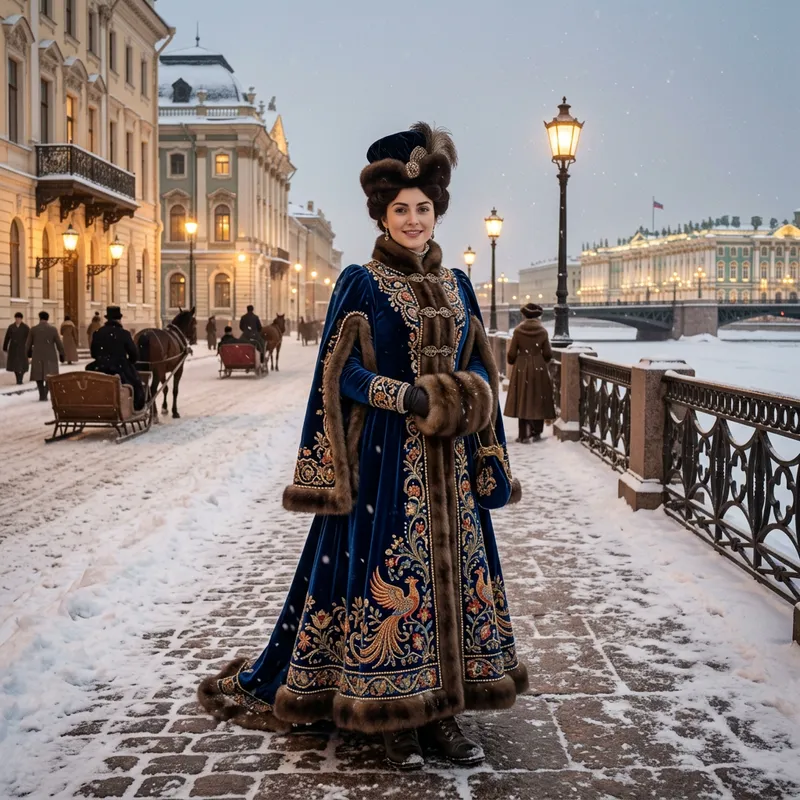 A woman of Russian descent in her late 20s, standing in full view on a winter day in Saint Petersburg, Russia, at the end of the nineteenth century. She is beautifully adorned in an elegant, long evening dress that showcases intricate designs inspired by Russian folklore. The surrounding architecture is indicative of the same period, with powdered snow adding a touch of serenity to the scene.