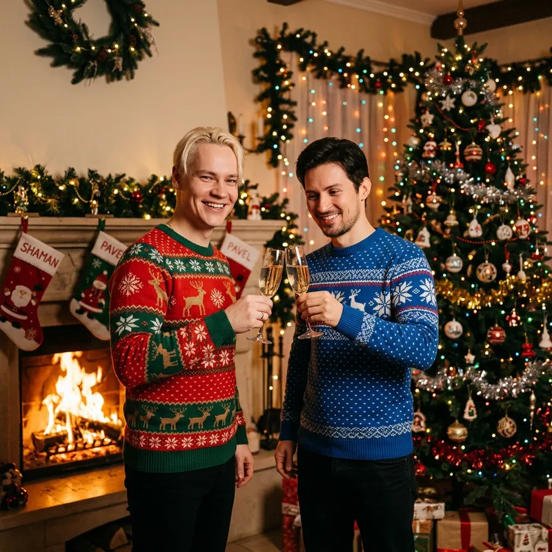 A male Russian vocalist, recognised as the 'Shaman', is celebrating Christmas with a famous male technology entrepreneur, renowned for his role in the creation of a popular messaging platform. They are in a festively decorated room, illuminated with twinkling fairy lights, a Christmas tree adorned with ornaments, and stockings hung by a cozy fireplace. They are toasting with champagne glasses, wearing festive sweaters, and the expressions on their faces encapsulate the joy and warmth of Christmas.