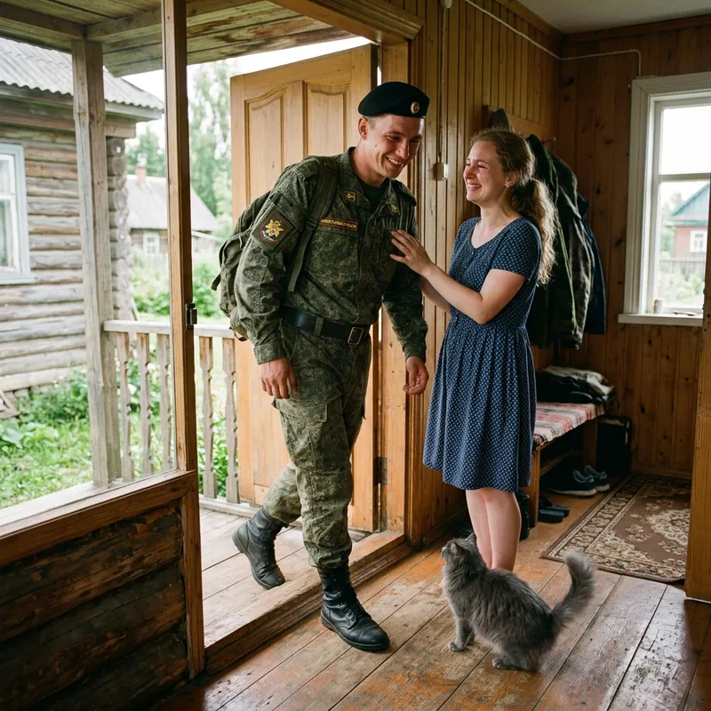 A Russian soldier in his standard military uniform, walking through the door of a quaint wooden house. His facial expressions radiate a sense of joy and relief. A Caucasian woman, presumably his wife, stands by the doorway. She is clothed in a simple but elegant dress, her eyes welling up with tears of joy upon seeing him. A small gray cat with dense, soft fur sits at her feet, its tail swirling in anticipation. The scene plays out in a realistic style, capturing the raw emotions of the moment.