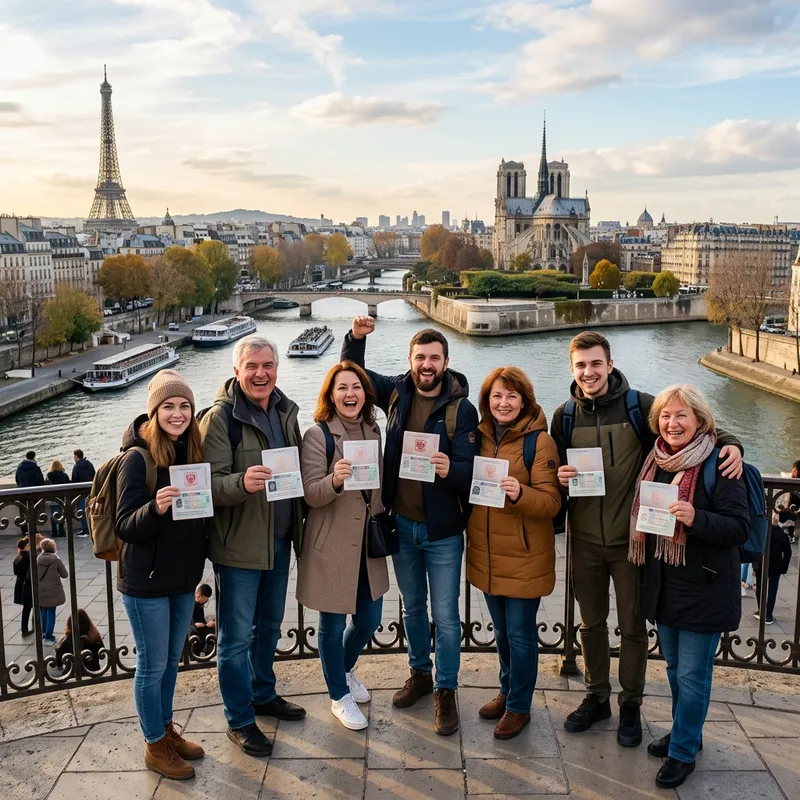 A realistic image of a group of Russian travelers, made up of men and women of diverse ages. In their hands they proudly display their freshly stamped travel visas. Behind them, the city of Paris unfolds in all its glory, with iconic monuments like the Eiffel Tower and Notre Dame Cathedral providing a romantic insignia of their travel destination.
