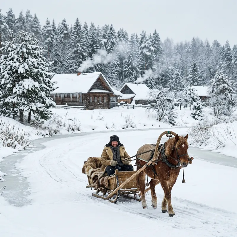Depict a typical Russian winter with heavy snowfall covering the pine trees, icicles hanging from the rooftops, and a frozen river in the foreground. Add a sleigh with a bundled-up Caucasian man on it for a level of human interaction. Make sure that the scene emanates the cold yet cozy feeling of a winter's day in Russia.