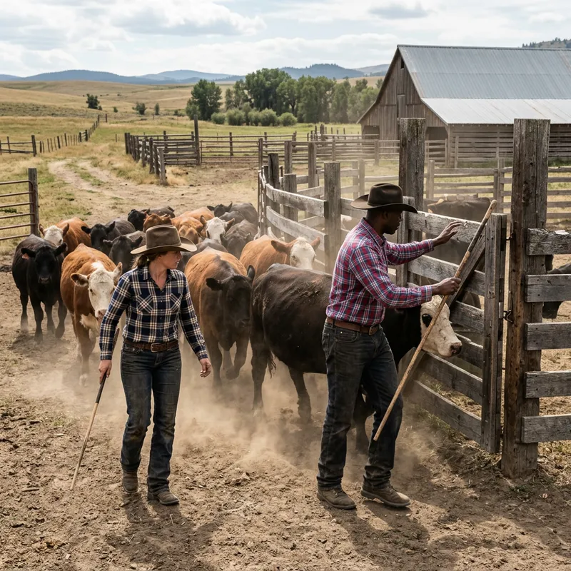 A country setting where a 5ft 9 Caucasian woman and a 6ft 5 Black man are working together, moving cows into a catch pen. They're dressed in traditional ranch attire: jeans, plaid shirts, sturdy boots, and cowboy hats. The woman works with a sense of confidence, her experience evident in her approach. On the other side, the man uses his height to his advantage, guiding the cows with strategic movements. The catch pen itself is rustic, well-used, and indicative of the agricultural lifestyle. Dust kicks up under the hooves of the cows as they shuffle into the pen.