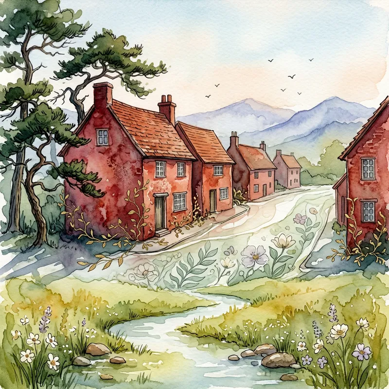 Old rusty antique crimson brick houses, countryside street like clear transparent glass with sage green leaves and light purple wet watercolor illustration alcohol ink ivory flowers, twisted Pine trees and gold vines and subtle shadows. In the field with a stream, stones and flowers ( beautiful masterpiece of surreal town : 1.3). Summer vibes mountain , birds in the distance