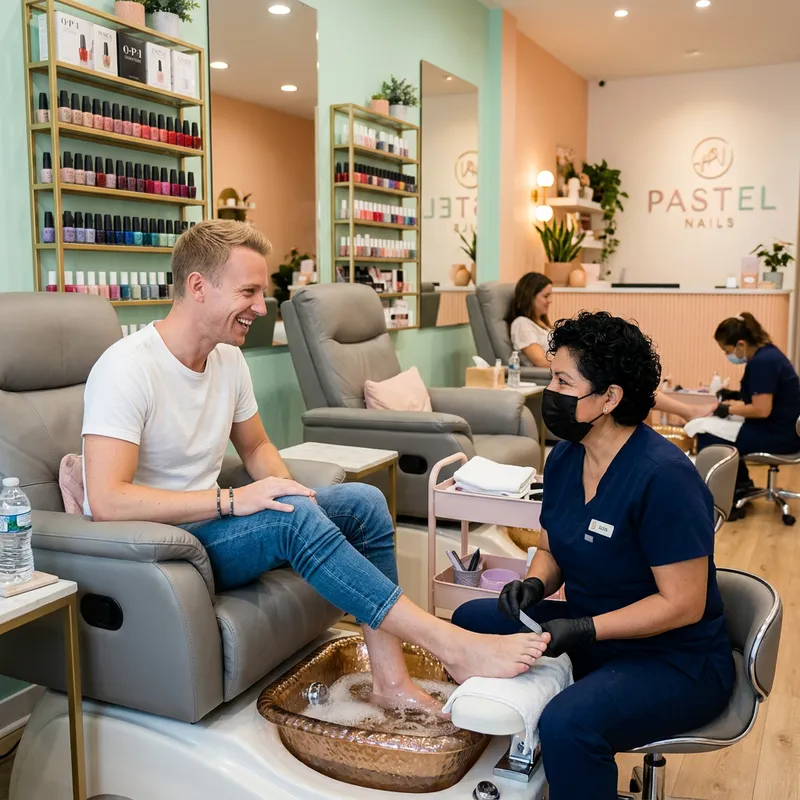 A man with a slim build and blonde hair in a nail salon, having his nails done while he is sitting on a pedicure chair. He is wearing casual attire consisting of a white t-shirt and jeans. The salon is modern and trendy with pastel colors, wall mirrors, and shelves stocked with various nail polish colors. The manicurist is a middle-aged, Hispanic woman with short, curly black hair, wearing a face mask and professional uniform. There's a friendly conversation going on between them, adding to the relaxed atmosphere in the salon.