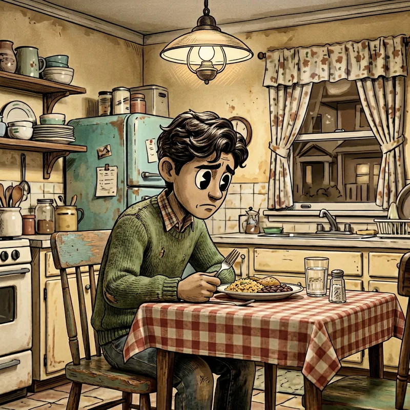 A 15-year-old Hispanic boy eating alone and looking sad, rendered in a style reminiscent of early 20th century animation, with three-dimensional aspects added. He is sitting at a small table with a plate of food in front of him. His eyes are looking downwards at his food, suggesting sadness or disappointment. His clothes, the room and the objects around him should also reflect a wholesome, animated universe where expressiveness and bright colors are paramount.