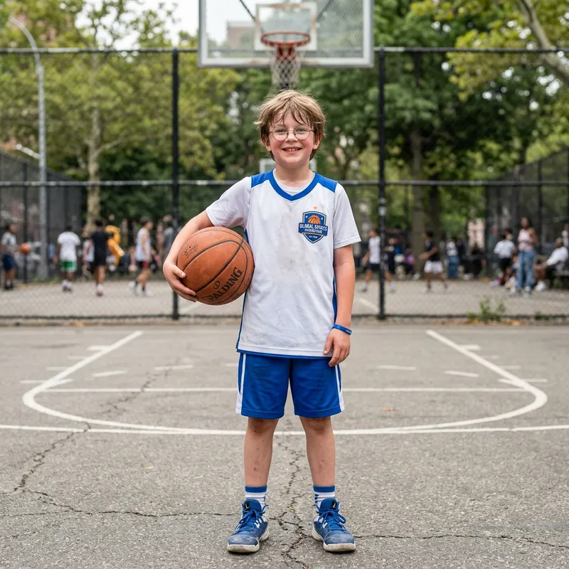 A somewhat scruffy boy with round glasses, wearing white and blue sportswear with the logo of a generic sports foundation, and a basketball