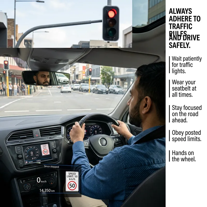 An educational scene promoting safe driving behaviors. Display a calm South Asian male driver with his seatbelt fastened, hands securely on the steering wheel, eyes focused on the road ahead. Traffic lights are clearly visible, and the driver is waiting patiently for a red light to turn green. In the rearview mirror, you can see a car also obeying traffic rules. The dashboard of the car displays the speed limit of the area which is being adhered to. Lastly, include a side note, advising viewers to always adhere to traffic rules and drive safely.