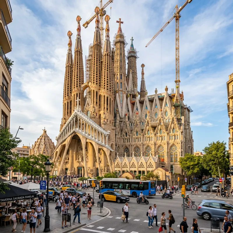 a detailed and captivating image of the Basilica of the Sagrada Familia, located in Barcelona. Capture the intricate architectural details of this famous landmark, including its towering spires, ornate facades, and beautiful stained glass windows. Include the surroundings as well, showing the hustle and bustle of the city around it