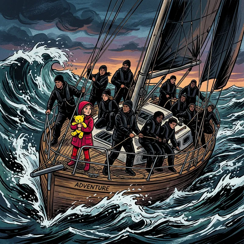 An illustration of a sailboat in the midst of a choppy sea, hosting numerous individuals all attired in black, and a young girl dressed in a vibrant crimson color, clutching a vivid yellow teddy bear. This image should be represented in a graphic art style.