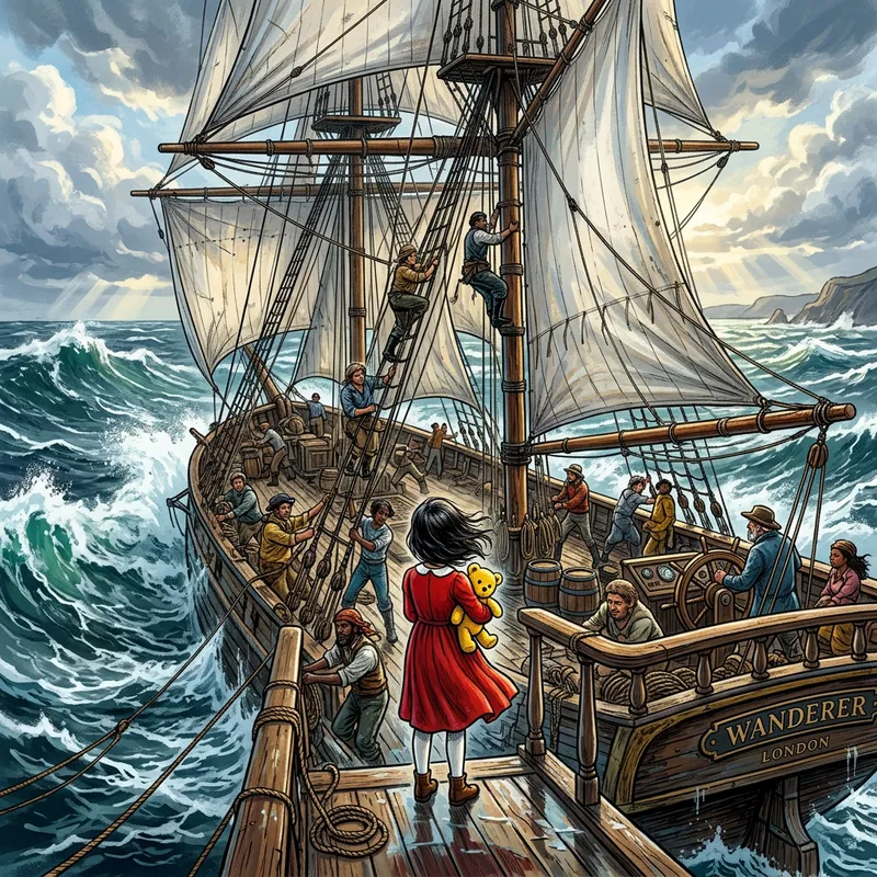 A vividly detailed illustration of a sailing ship, adorned with spread sails, navigating in the midst of a tumultuous sea. Aboard are numerous individuals of diverse descent and gender, all busy maintaining the workings of the ship. A young girl, seen from behind, stands out from the crew, her red dress contrasting with her white stockings. In her arms, she tightly clutches a yellow plush toy. The image captures the charm and detail characteristic of graphic arts style.