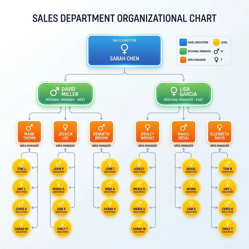 Visualize an organizational chart of a sales department. The hierarchy begins with the Sales Director at the top. Depict different levels of management below the director, such as regional managers, area managers, and sales executives. Each level should be represented by various shapes like rectangles or circles connected by lines indicating their reporting structure. Remember to include the symbol for male and female individuals at each level, ensuring a diverse gender distribution. Differentiate the levels with colour coding or size variations to indicate their importance and role within the department.