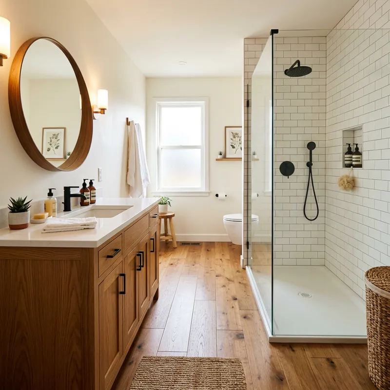 Stunning Bathroom Design: White Shower & Wooden Elements