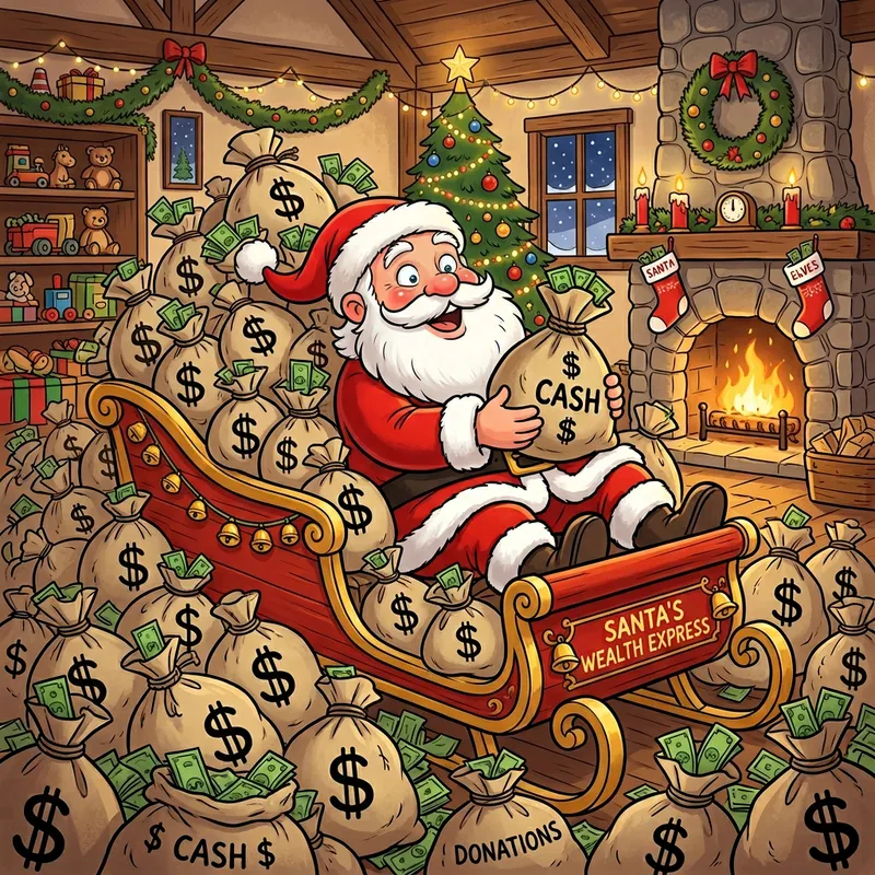 A cartoon illustration showing Santa Claus, a jolly elderly man with a chubby physique, rosy cheeks, and a prominent, bushy, white beard. He is dressed in his traditional red and white outfit and a pair of black boots. He is inundated with bags bursting with cash, each bag tagged with a dollar sign. His bright, twinkling eyes display a mix of surprise and joy. Behind him, a cozy fireplace casts a warm, festive glow, further illuminating the mountain of wealth on his wooden sleigh.