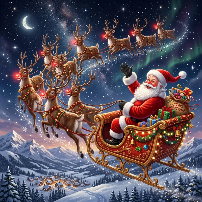 A jovial image of Santa Claus, a plump man with a white beard and red suit, joyously riding in his sleigh, which is being pulled by a team of reindeer through the night sky. The stars twinkle brightly as the reindeer prance across the sky, each one with a shiny, glowing red nose.