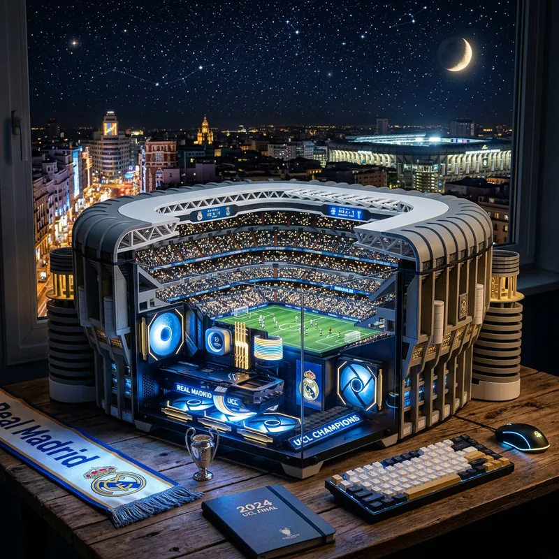 Create an image of a computer that is designed in the shape of the Santiago Bernabeu Stadium, the home ground of a famous Spanish football team. The visible components inside the computer resemble the internal layout of the stadium. The computer is placed in an enchanting nighttime setting, the sky is filled with stars, and the ambiance denotes a magical night during a significant European football championship.