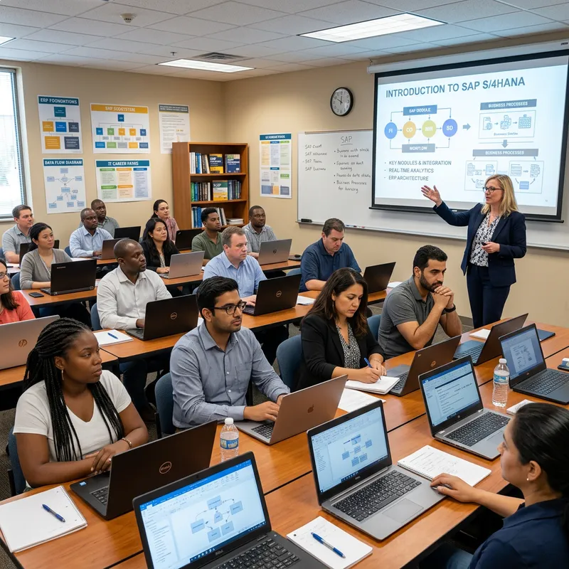 Generate an image of a knowledge sharing session on the topic of SAP software in a standard classroom setting. Represent the scene as a diverse group of adult learners, from various descents such as Caucasian, Hispanic, Black, Middle-Eastern, and South Asian, seated at desks with laptops open in front of them. At the front of the room, a Caucasian female instructor with glasses gestures toward a projection screen featuring diagrams and bullet points about SAP software. The walls are adorned with educational posters, and in the corner of the room, a small shelf of reference books can be seen.