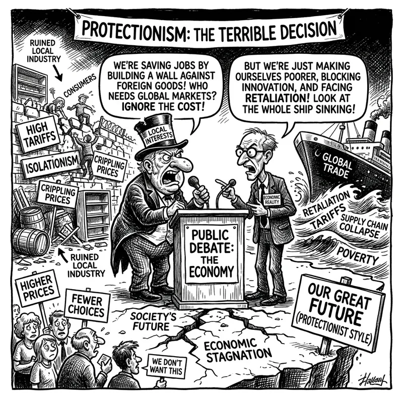Satirical political cartoon depicting a pessimistic debate about the terrible decision that is economic protectionism in a society, thick ink, cross-hatching, black and white, humorous, featuring no current president.