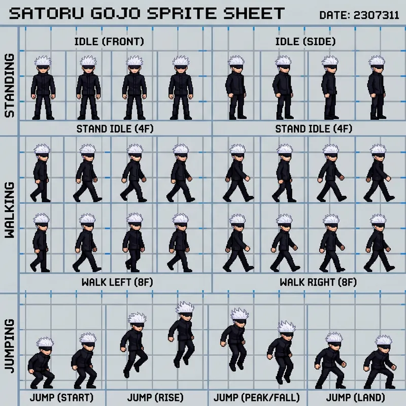 Satoru Gojo Sprite Sheet: Walking, Jumping & Standing Poses