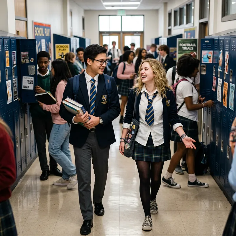 A scene from a school-based story featuring a male and female protagonist. The young man, of East Asian descent, is studious, wearing glasses and a neat uniform with a tie. The young woman, of Caucasian descent, is vivacious, her uniform slightly disheveled and a carefree smile on her face. They are walking down a school corridor, lined with lockers. The atmosphere is lively with students of diverse descents moving around and engaging in different activities.