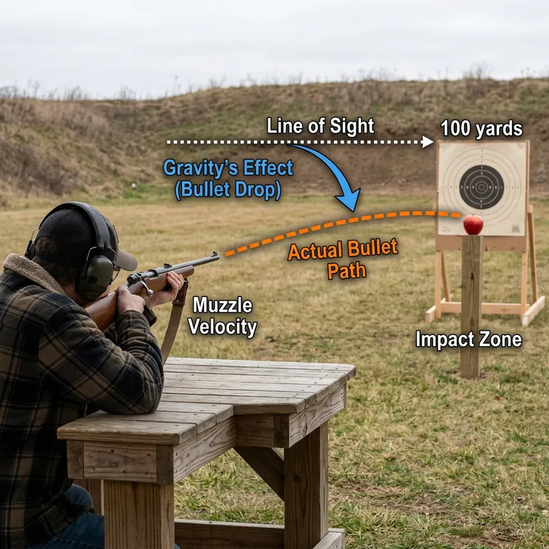 Create an image depicting a scientific demonstration of the trajectory of a fired bullet. Show the shooter's position, but do not include any identifiable human targets. Instead, use a non-human, inanimate object such as a bullseye or an innocent fruit, like an apple, to represent the destination of the bullet. Include visible lines representing the gunfire path, with appropriate curvatures to demonstrate gravity's impact on the bullet's journey. Ensure that there are no violent or graphic elements in the image to maintain a peaceful and educational purpose.