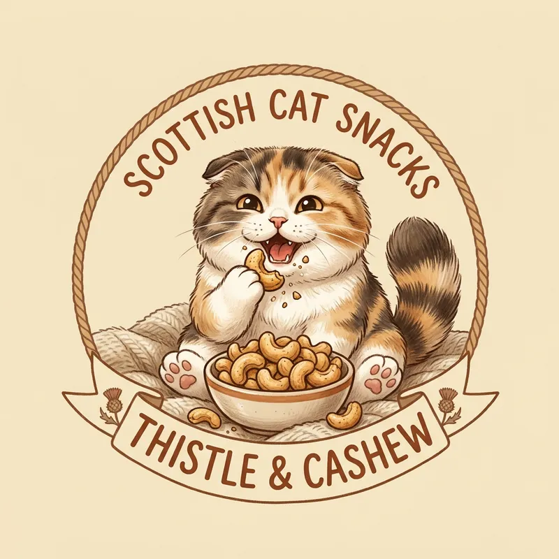A logo featuring a Scottish cat munching on cashew nuts. The cat possesses typical Scottish cat features such as folded ears, dense coat and round face. The cashew nuts have an appealing realistic texture musically highlighting their crunchy characteristic. The background of the logo is a simple, solid color to not detract from the main image. The overall design combines a playful and cozy energy to invoke a sense of warmth and comfort.