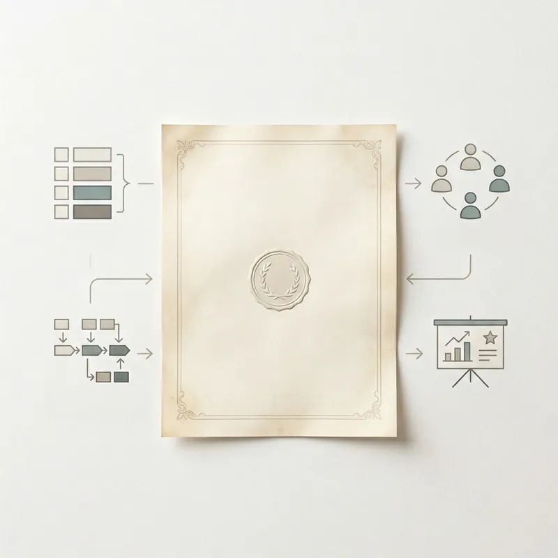 Picture a minimalist representation of a scrum certification. The overall color palette is subtle and neutral. Central in the image is a ceremonial parchment, signifying certification. To its sides, iconography related to Agile methodology is subtly incorporated, including backlog, sprint planning, daily scrum, and sprint review. There's no explicit text but the overall design hints at the progression and evolution involved in achieving a scrum certification.