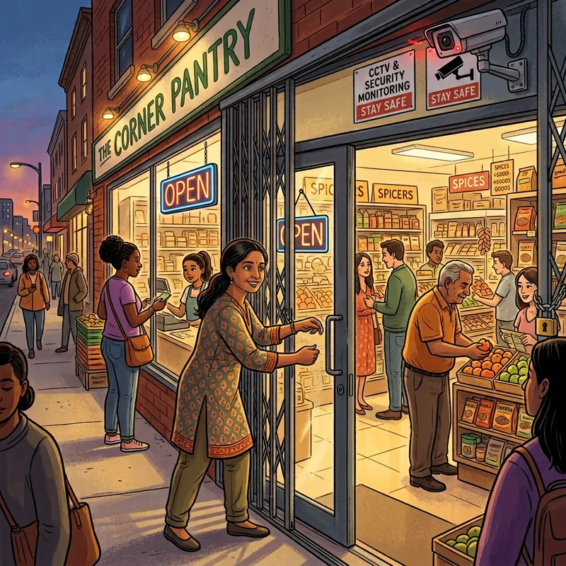 An illustration of a small scale business being secured with limited resources. Show an entrepreneurial woman in her forties of South Asian descent, focused and determined. She uses simple but effective methods to keep her business safe, like locks and cameras. Include a small store with the 'Open' sign, thriving with customers from different descents and genders. Make sure to depict the sense of security, resilience, and bustling activity in this small thriving business.