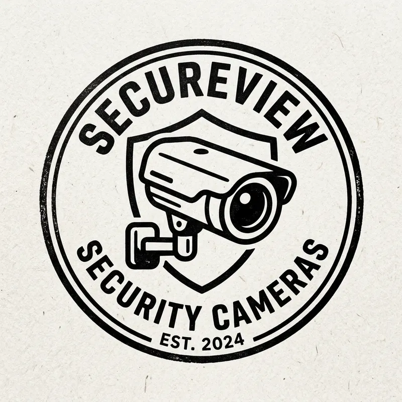 A logo design for a security camera to be used as a stamp imprint. The design is in black and white colours. The logo should effectively communicate safety and surveillance, perhaps by incorporating a simplified image of a security camera or optics associated with it. The design should be bold and simple to allow for clear and effective usage as a stamp imprint.