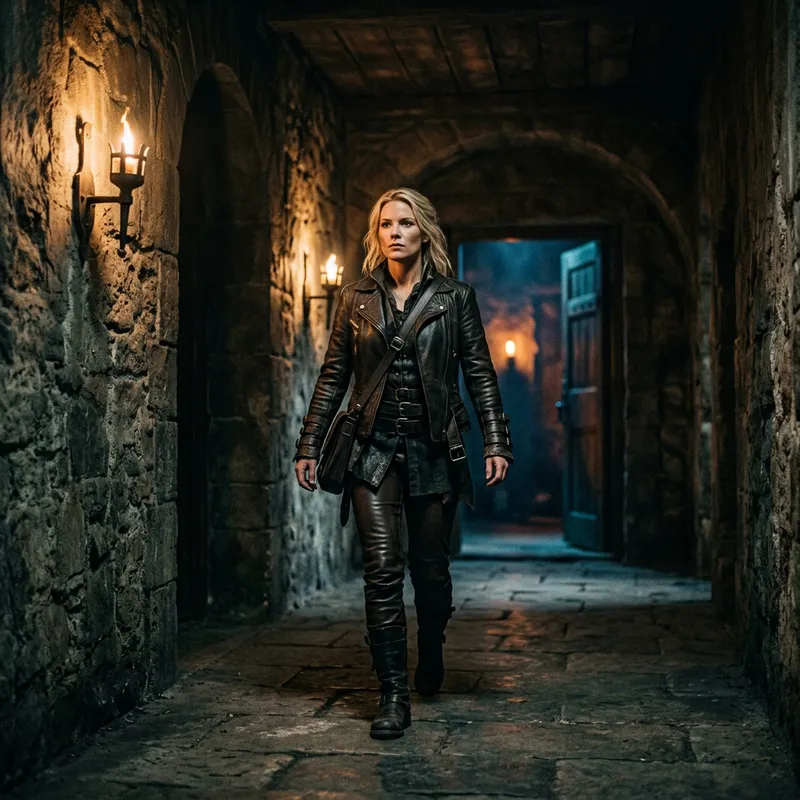 A confident woman with blonde hair, dressed in a dark leather outfit, walking down a dimly lit hallway towards a mysterious room. The scene is characterized by dramatic low-key lighting creating an edgy and dark atmosphere, reminiscent of the style prevalent in vintage photography. Her stance is strong, reflecting her inner strength and resolve. The scene is reminiscent of a fantasy-inspired narrative and has been captured with a similar level of professional quality that would be possible with equipment like a high-end digital camera. The overall setup hints at a conceptual studio shoot.