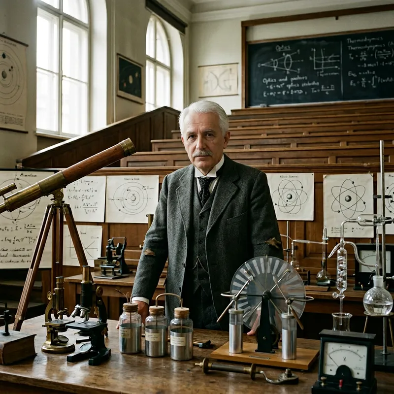 Image of a senior physics scientist, not a public figure, looking at the camera in a lecture hall equipped with devices and tools for a physics experiment. The scientist has white hair, a mustache, and is dressed in early 20th-century academic attire. The room around him brims with classic scientific apparatus: telescopes, microscopes, charts, etc., all hinting at a rich history of physical exploration