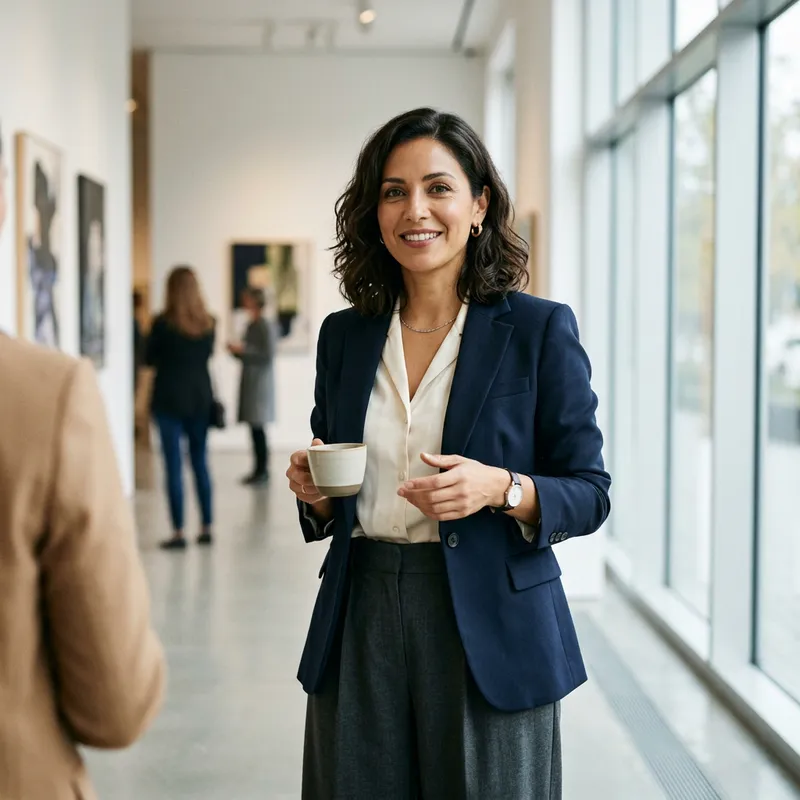 A confident woman, radiating charm and elegance while maintaining a respectful and appropriate demeanor. She carries herself with self-assured poise, dressed in stylish clothing suggesting her refined taste. Her expressive eyes offer a glimpse of her strong, independent spirit. This woman embodies strength and beauty in equal parts. Her features suggest a Hispanic descent, but she defies any stereotypes associated with her heritage, instead embodying the unique individual she truly is.