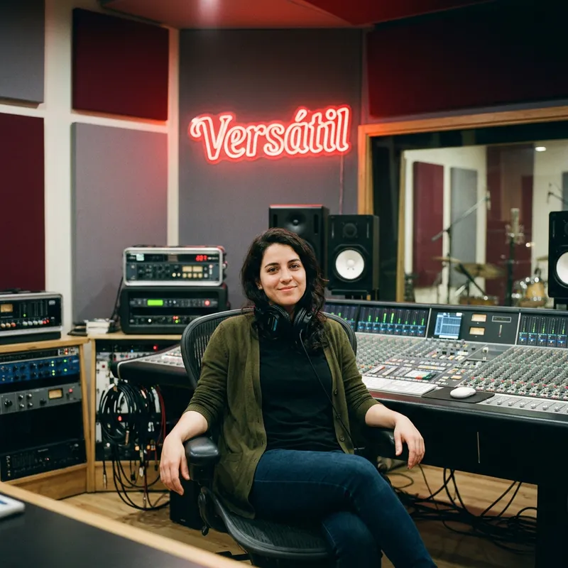 sitting in a recording studio background, sitting in the studio chair, album name 'Versátil' using neon red colors.