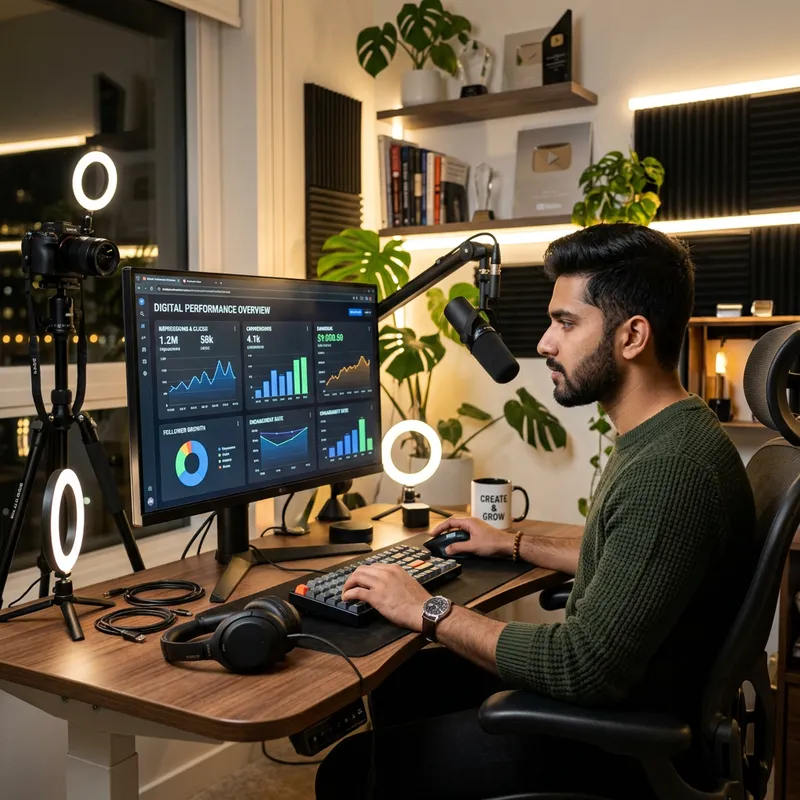 A young South Asian male influencer is in a room with a stylish and modern setup, focusing intently on his computer screen that displays a dashboard of performance metrics. There are diagrams and graphs depicting clicks, conversions, and earnings. He has a look of determination and ambition on his face as he aims for continuous improvement in his digital career. The room has a blend of cozy residential and high-tech elements, with soft lighting, indoor plants, and expensive digital equipment, denoting his profession.