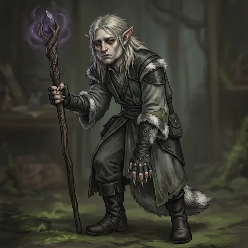Depict a character named Seraphil Nocturne. An Elven Warlock intricately tied to the sin of Sloth. His once enticing beauty now morphing due to his curse. His face, previously glowing, now has sharper characteristics with eyes encapsulated by indifferent shadows. His Elven skin has begun to grow a layer of grey fur, symbolizing his transformation. Once radiant, his silver-blond hair now has the texture of a badger's. His ears, once pointy, have tilted backwards, making them look more like a badger's ears. His attire, previously vibrant, is now mostly grey and black with fur accents that resemble a badger. Physically, his traditional thin Elven figure has begun transforming, with claws forming on his fingers and a bushy tail growing secured by his clothing. Seraphil's magic staff, covered in symbols resonating with the power of Sloth, capsules his transformative essence. His gaze is filled with deep apathy and energy reflecting lethargy, making his mere presence contagious. In his entirety, Seraphil Nocturne embodies the qualities of a badger-elf, highlighting his ongoing curse of Sloth. The image should resemble a D&D character illustration.