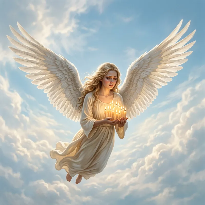 An angel with a serene expression, soaring in the soft blue sky with wispy white clouds. Its wings are wide open, showing beautiful white feathers highlighted by sunlight. The angel cradles a handful of lit candles that softly glow against the backdrop of the sky. The flickering candlelight reflects upon the angel's melancholy eyes, adding an aura of sadness emanating from the heavenly figure.