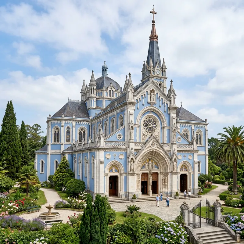 Imagine a large Catholic temple with impressive architecture. Its exterior consists of blue and white walls that harmoniously blends together, creating an appealing sight. The temple has tall, arching doorways and numerous windows allowing for natural light to seep in. Decorative elements such as carvings, coves, and moldings adorn the walls. The roof, steep and high, finishes with a towering spire. Surrounding the temple is a calm and serene atmosphere represented by lush gardens with a variety of plants and blooming flowers.