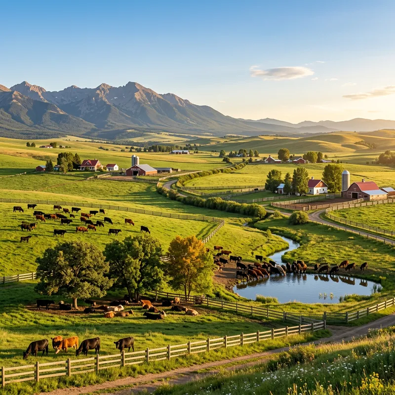 A panoramic image of the countryside with several farms scattered throughout the area. In these farms, there are multiple herds of cattle, some feeding on a lush green pastures, some drinking from a nearby pond, and a few relaxing under the shade of the trees. The farms are enclosed by wooden fences, and the farmhouses with red roofs can be seen at a distance. The sky above is clear with the golden rays of the sun enveloping the scene, and majestic mountains dominating the background, giving a serene and peaceful atmosphere to the whole scene.