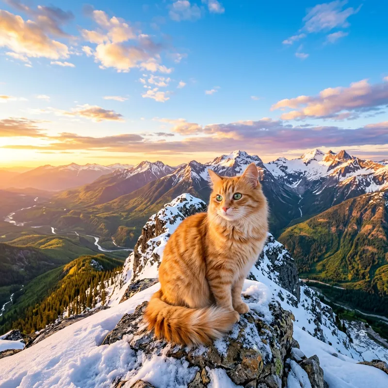 Depict a serene scenario of an adorable orange tabby cat with sparkling green eyes and a fluffy tail, comfortably sitting on top of a large mountain. The mountain reaches high into the sky, its peak dusted with white snow, contrasting against the lush greenery further down. The sky above is a clear, vibrant blue with a few fluffy white clouds scattered about. Rays of the setting sun paint the landscape in warm, golden hues, casting long shadows and an ethereal glow on the cat and the mountain.