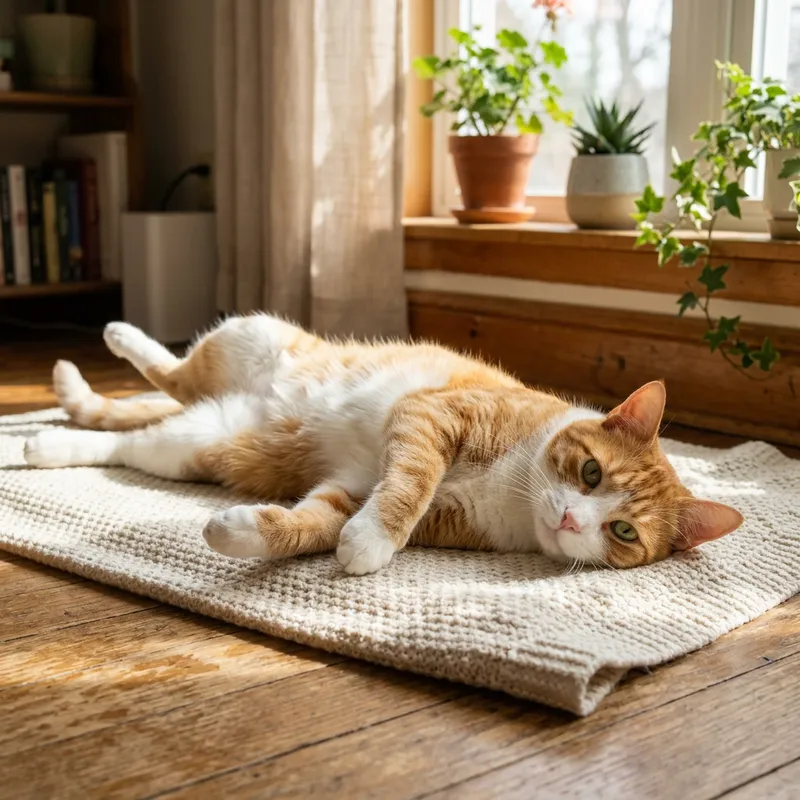 Visualize an average domestic short-haired feline. The cat is resting lazily, fully stretched out with its belly exposed. Its coat is a distinct blend of orange and white, creating a playful contrast. The eyes, a soothing shade of green, shine with curious innocence. The sunlight filtering in through an unseen window casts playful shadows around the soft silhouette of the creature, accentuating the overall calm atmosphere.