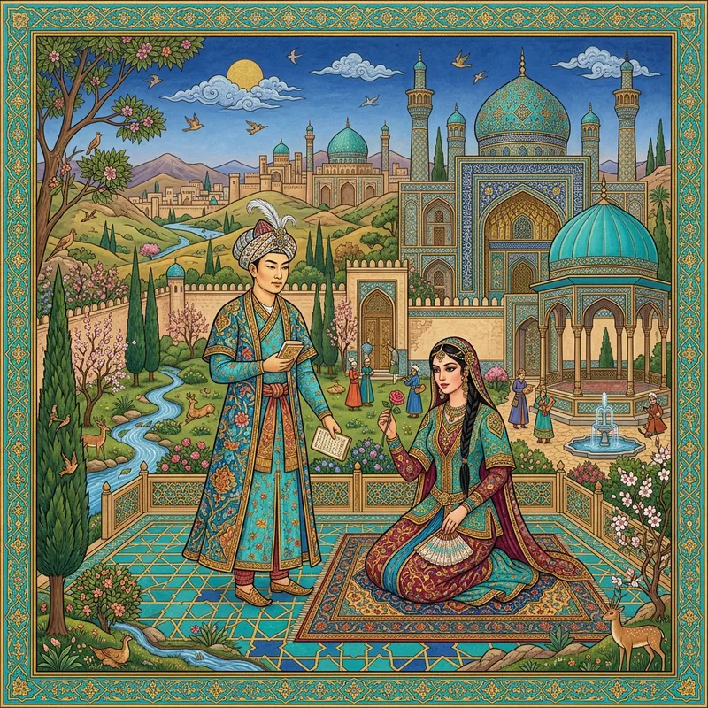 A traditional Persian miniature illustration depicting a serene landscape adorned with lush greenery and ornate buildings, reflecting the intricacy of Islamic architecture. Humans in this scene should include an Asian man and a Hispanic woman, clothed in traditional Persian attire, distinctly elaborating the patterns and colorfulness of such costumes. The vivid colors of turquoise and gold dominate the scene, as a hallmark of the intricate craftsmanship of Persian miniaturists.