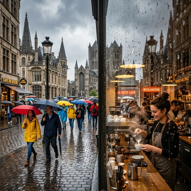 Picture a serene cityscape on a rainy day. Gray clouds fill the sky, casting a soft light on the wet streets below. People of various descents and genders, clad in raincoats of different colors, are walking with umbrellas. Puddles on the cobblestone streets reflect the surroundings - the Gothic architecture of the buildings, the old lampposts, and the bright signs of small shops. The rain is pouring, creating a soothing rhythm on the windowpane of a nearby café where a barista is preparing a cup of steaming coffee.
