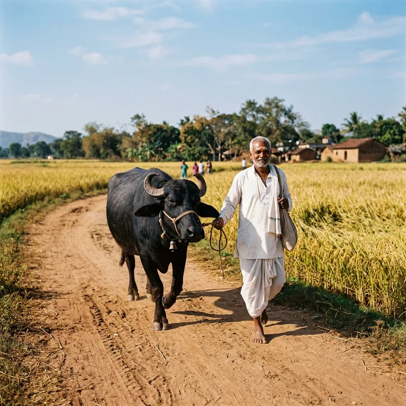 A South Asian Brahmin man, clad in traditional attire, strolling down a dusty country road. By his side, a robust buffalo with a thick, indigo coat and strong horns, plods along. Overhead, there's a clear, sunny sky, and distant fields of tall golden crops sway gently in the breeze. The atmosphere is serene and peaceful, capturing the essence of rural life.