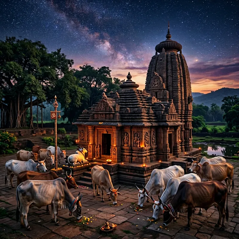 An ancient temple dedicated to the Hindu deity Shiva, set amid a serene landscape. A group of cows, revered in Hindu culture, are surrounding the temple, bending their heads down in a gesture that symbolizes adoration and respect. Meticulous detailing to portray the architecture, statuary, carvings, and the tranquil ambiance. The cows are peaceful, their bodies richly detailed to capture their calm demeanor. The sky overhead is a twilight spectacle of stars, radiating a mystical aura that complements the sacred scene.