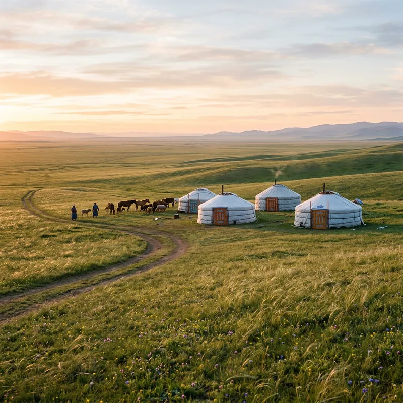 Scenic Steppe Landscape with Traditional Yurts and Wildflowers