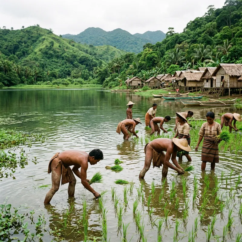 A serene village in the Philippines is surrounded by a verdant lagoon. Indigenous people, who resemble the Aeta in their traditiona attire known as ba-ag, are engaged in planting rice. The scenery is beautiful, radiating an aura of purity and authenticity. The entire vista feels untouched by modernity, a snapshot of tradition and culture persevering in its original form.