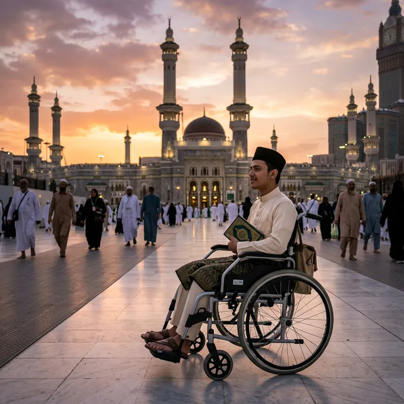A Middle Eastern male student in traditional Malay attire sits on a lightweight wheelchair, making his way towards the Great Mosque of Mecca, also known as Al-Masjid Al-Ḥarām. He is carrying the Quran and is navigating peacefully towards the mosque. The backdrop is adorned by a beautiful orange-pink sunset that casts a serene ambiance. The mosque's large architecture depicts impressive silhouettes against the twilight, with its high-reaching domes and minarets. This scene epitomizes a moment of tranquility and reverence.