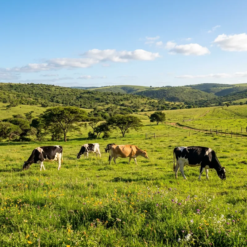 A pastoral scene featuring a few dairy cows leisurely grazing in the verdant grasslands of South Africa. The lush green stretch of meadow, dotted with colorful wildflowers and the occasional tree providing shade, perfectly complements the clear blue sky overhead. The dairy cows, with their glossy coats reflecting the warm sunlight, peacefully graze on the fresh grass, offering a picture of serenity and tranquility. In the distance, the pastoral landscape gently gives way to rolling hills, completing the idyllic scene.